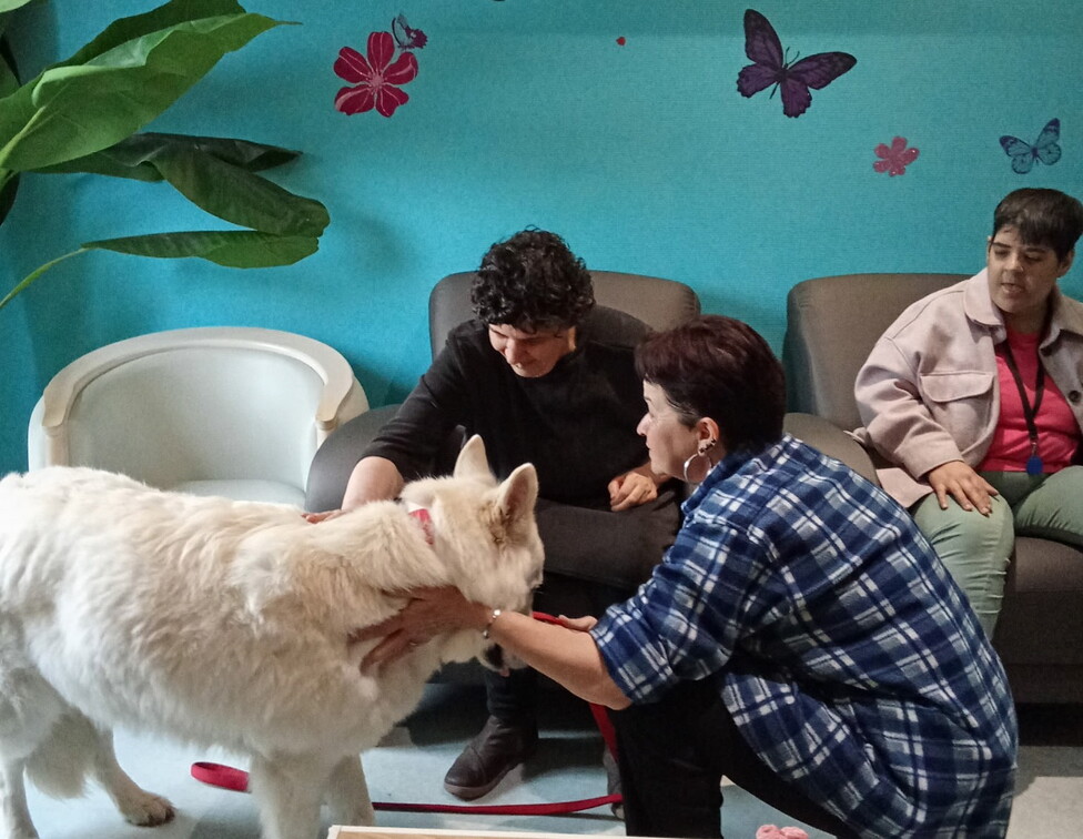 Dans la clinique psychiatrique, les séances prennent une forme plus interactive. Après une présentation de Naya et de son histoire, les patientes sont invitées à échanger autour de l’animal, à la caresser, lui donner des friandises ou à la promener.