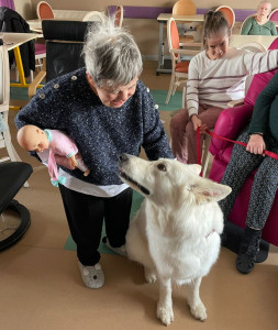 « J’ai suivi une formation à la médiation animale avec ma chienne Naya. Elle participe désormais au quotidien des établissements, puisqu’elle est présente à l’accueil quand j’y suis, mais aussi lors des séances que j’anime désormais dans les unités », témoigne Fabienne Colombier.